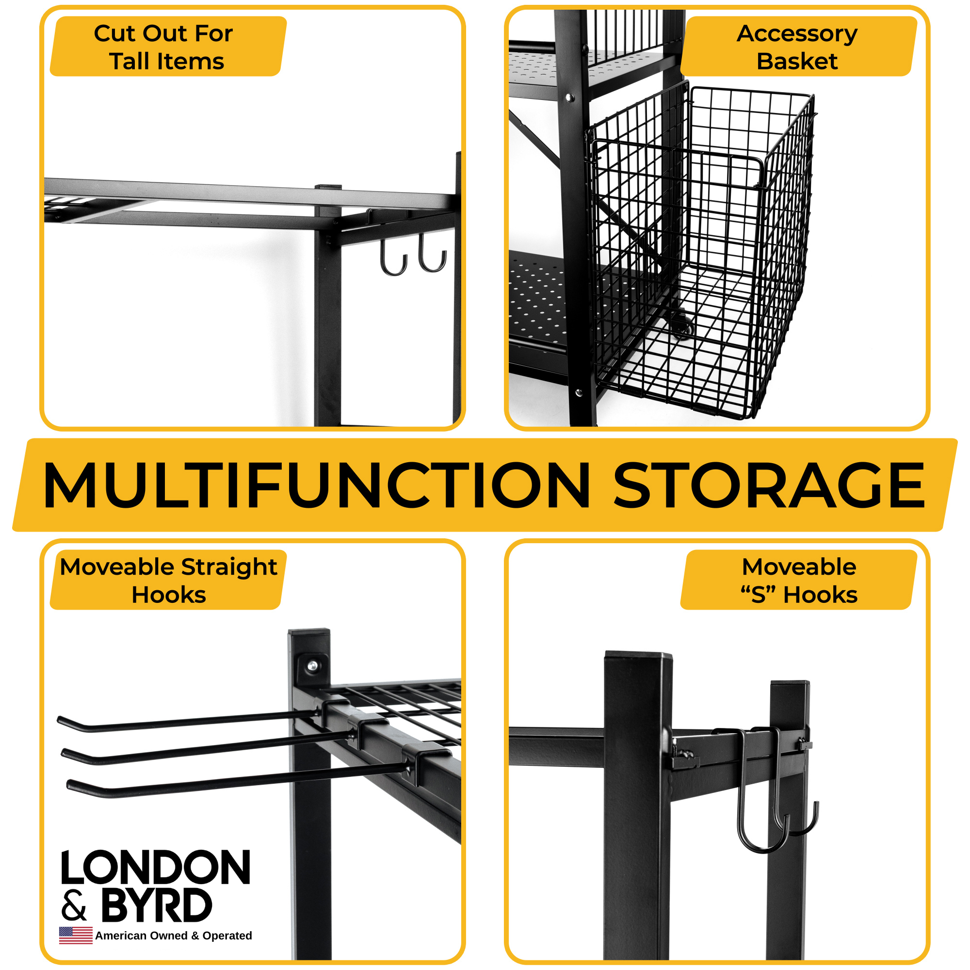 Enjoy the convenience of an added basket and two different types of hooks on our yoga mat rack and home gym organizer, providing extra space for accessories like resistance bands.